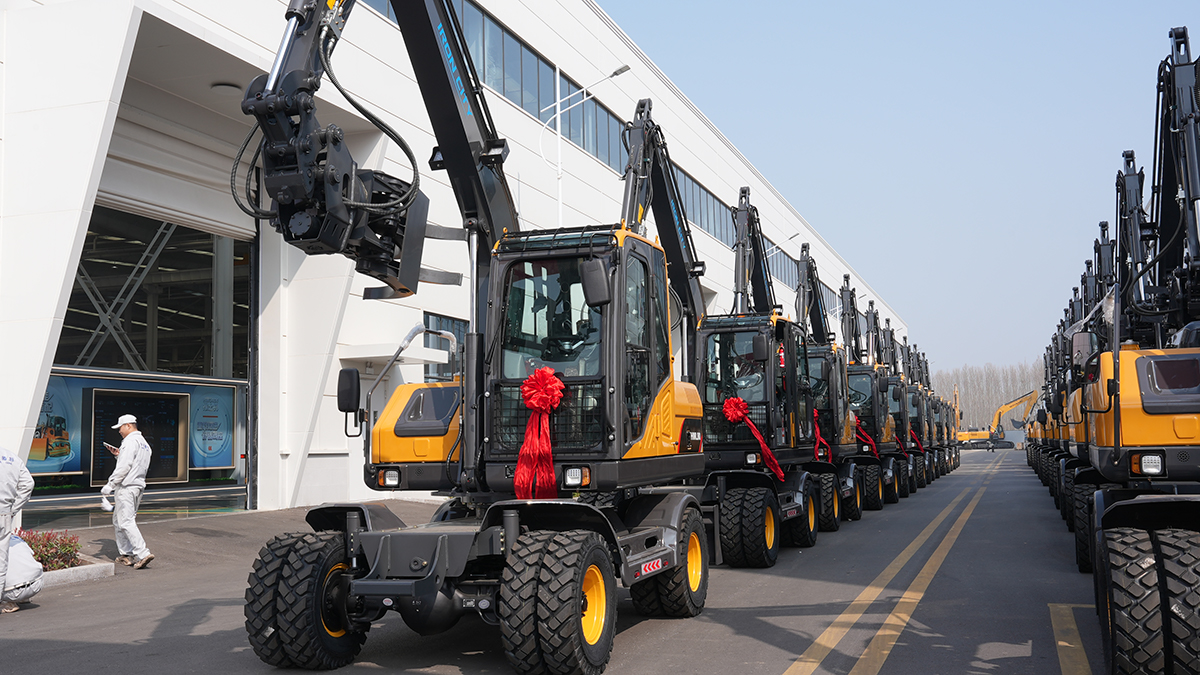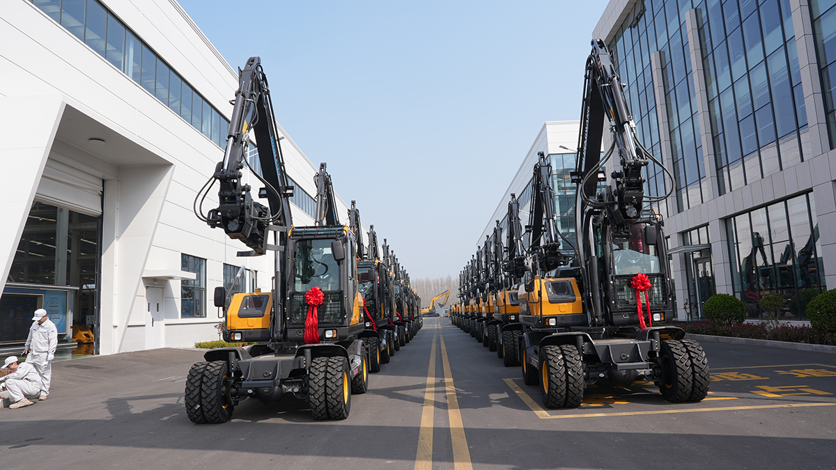 2026年3月21日,在恒旺绿色智能制造生产基地内,20台崭新的HWL80轮式挖掘机整齐列队,即将启程远航,发往海外市场。