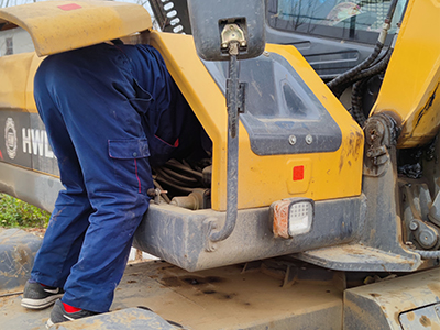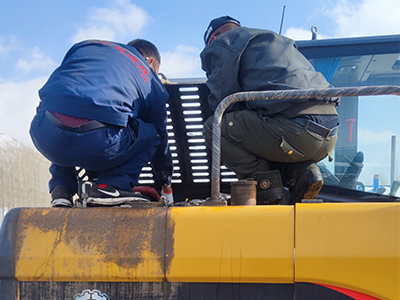 1.检查大小臂、铲斗、驾驶室、空滤、配重等各部件情况是否有开裂、损坏、松动等情况,并及时更换调整。